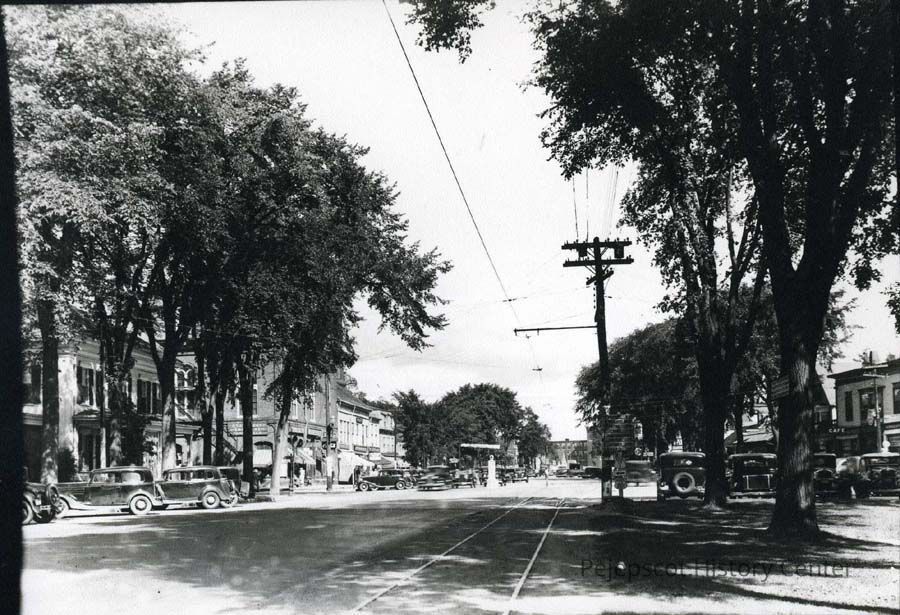 A B/W photograph of Maine Street looking north from the intersection with Pleasant Street, Brunswick, ME. Dated 08/05/1931.