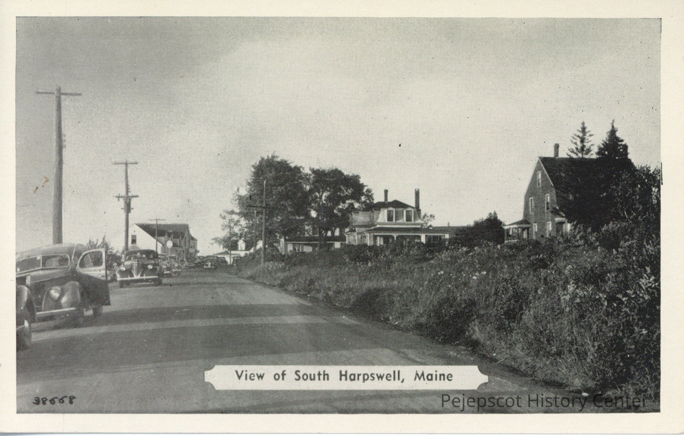 Black and white photo postcard of road lined with houses and automobiles in South Harpswell, Maine.