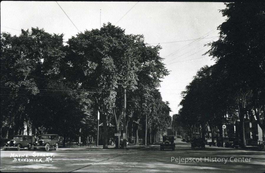 A B/W photograph of Maine Street looking south from the intersection with Pleasant Street, Brunswick, ME. The Mall can be seen on the left. Dated 08/05/1931.