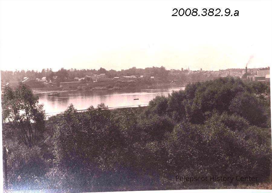 A B/W photograph of "View of Landing." The Androscoggin River can be seen. Undated