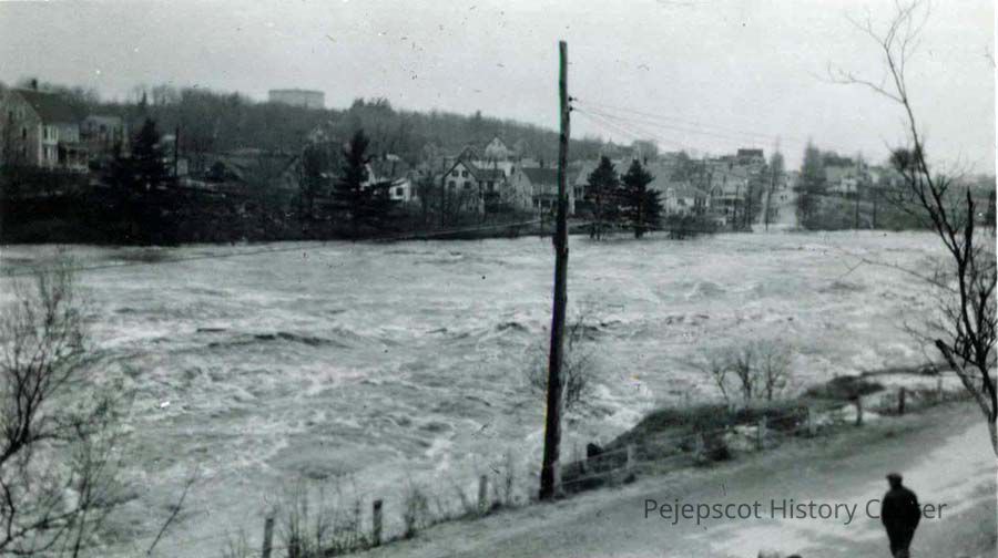 A B/W photograph of the flooded Androscoggin River, looking at the houses on the Topsham side from Mill Street in Brunswick during the flood of 1936.