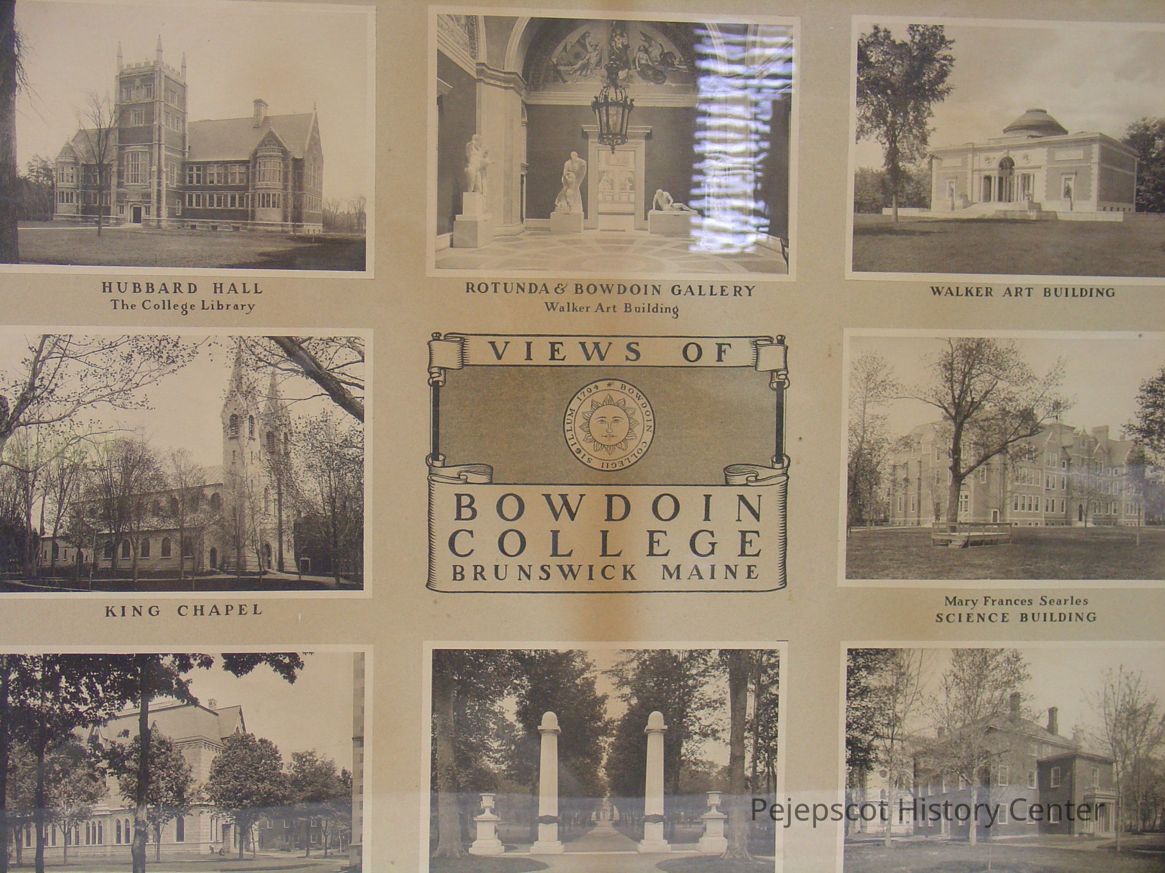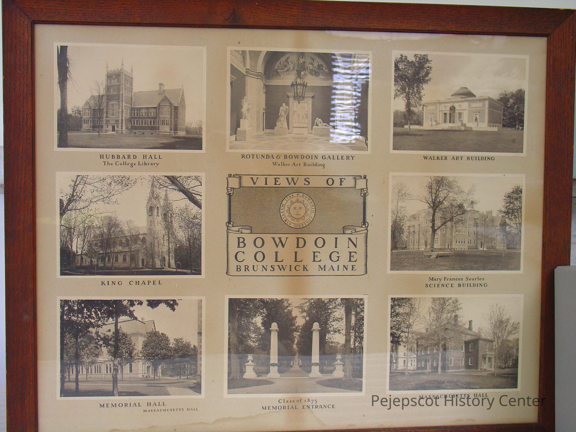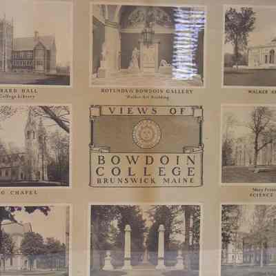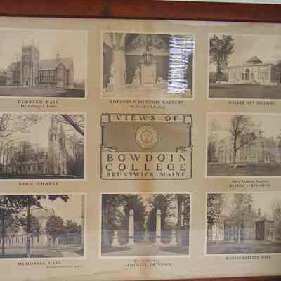 Eight B&W photos of Bowdoin College Buildings, Brunswick, Maine. Views of Hubbard Hall, Bowdoin Art Gallery, Walker Art Building, King Chapel, Searles Science Building, Memorial Hall, the 1875 Memorial Entrance, and Massachusetts Hall. Each photo is 5.25" x 7.75" on a single mat behind glass in a wood frame. Overall size is 30.5" h x 24.5" w. Undated.Lexicon