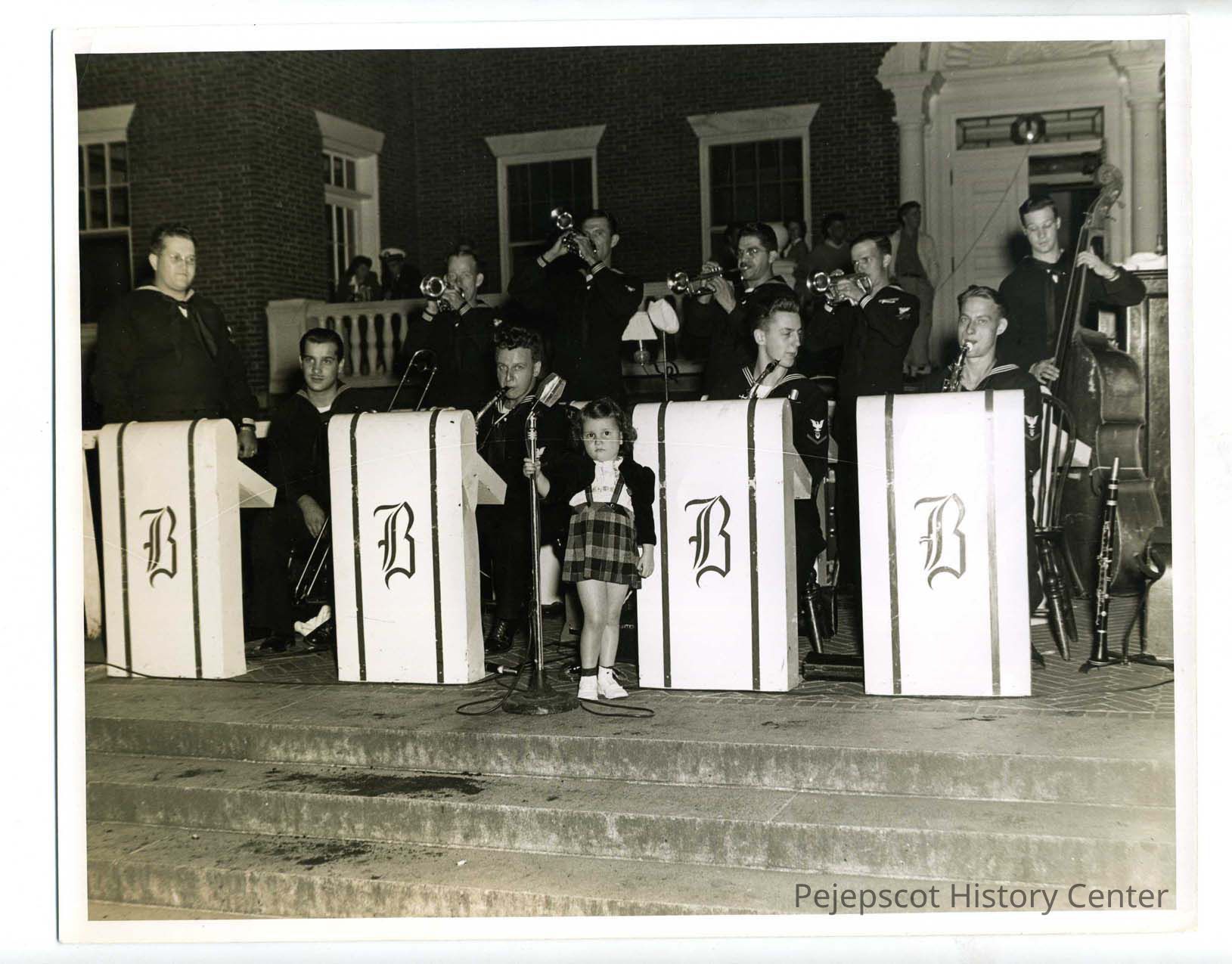 A little girl stands in front of a Navy band playing for the town wide VJ Day celebration on the Bowdoin campus on September 2, 1945.