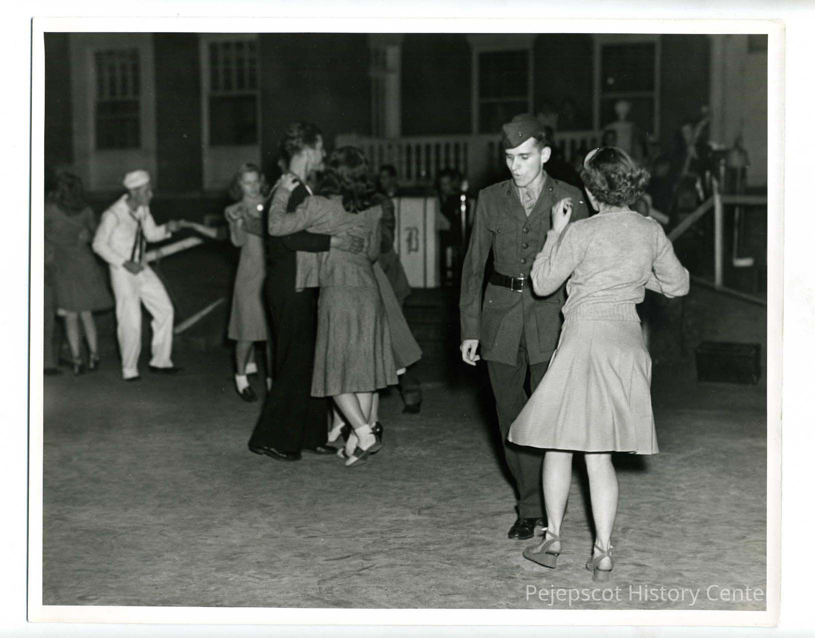 Navy men and civilians dance at the town wide VJ Day celebration on the Bowdoin College campus on September 2, 1945
