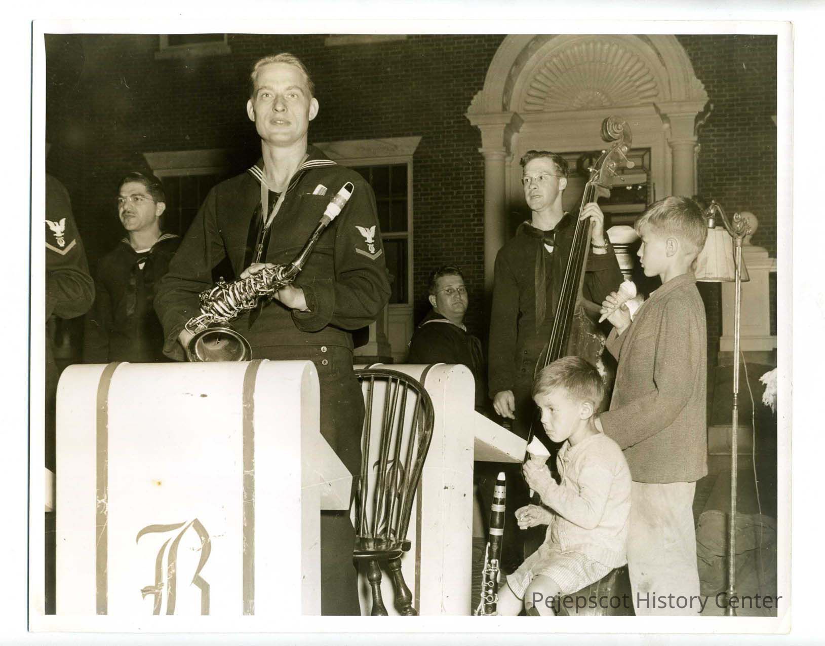 Two little boys eat ice cream cones while they watch a Navy band play at the town wide VJ Day celebration on the Bowdoin Campus on September 2, 1945.