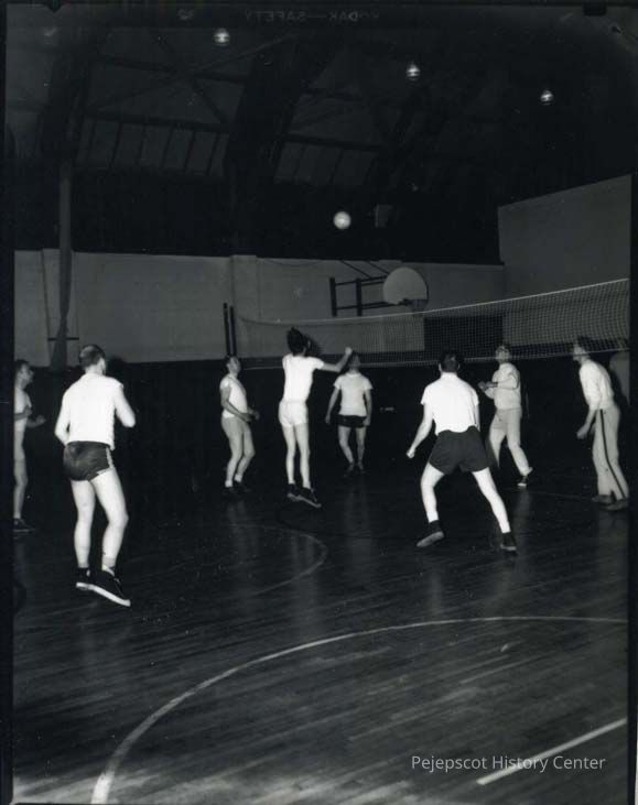 People playing volleyball at the Brunswick Recreation Center. negative made