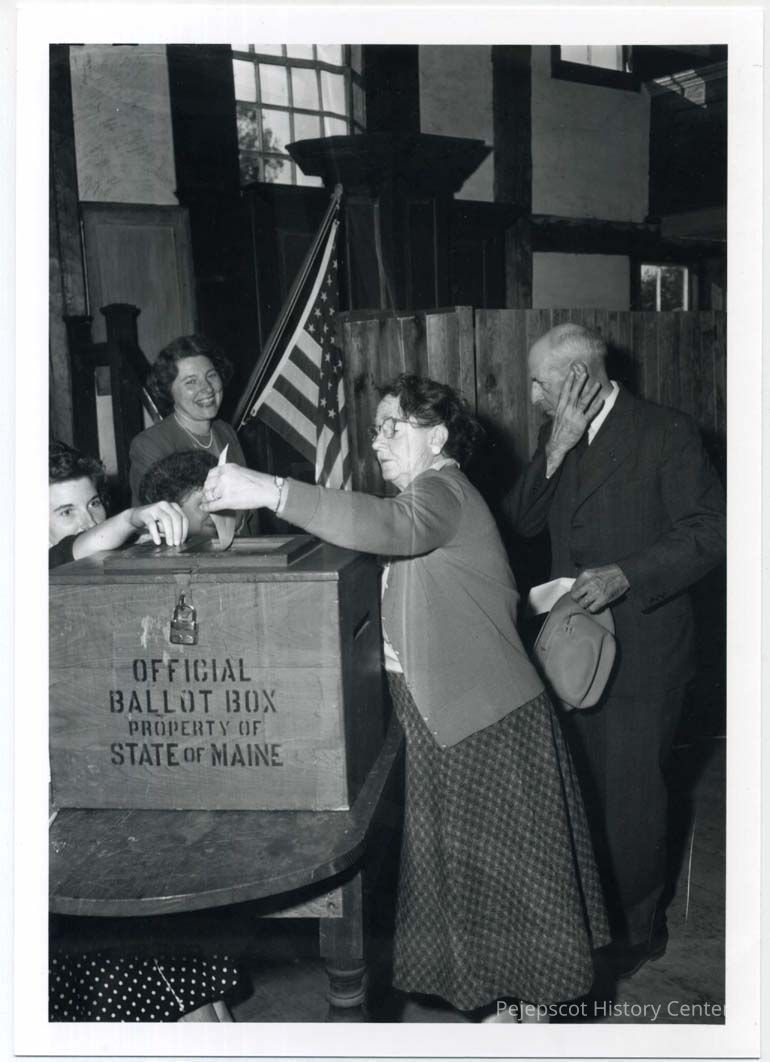 Two people line up to slide their votes in the Harpswell ballot box (1950-55?) as three clerks watch.