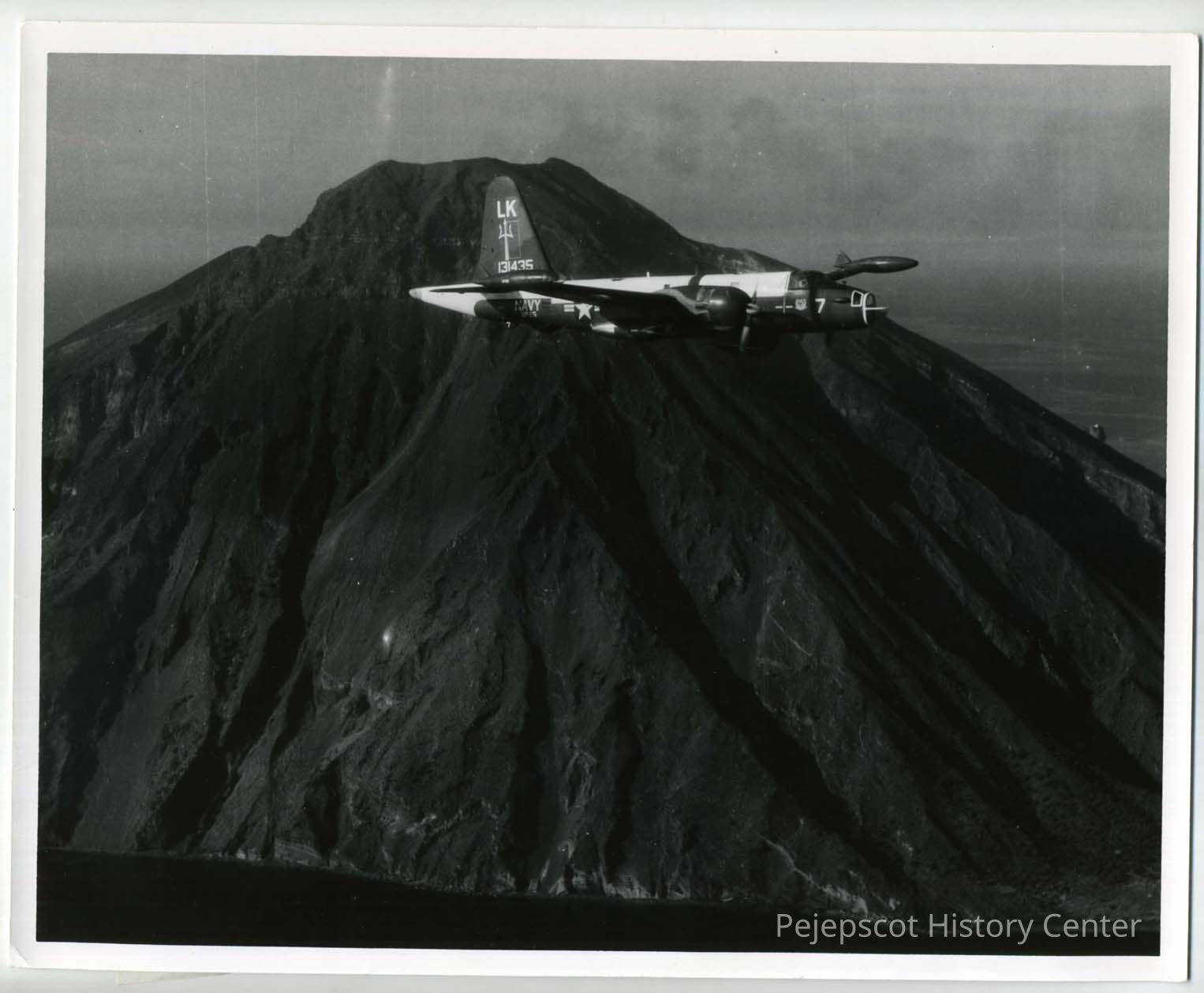 A VP-26 SP2E 'Neptune' patrol bomber passes Stromboli, an active volcano, during an anti-submarine patrol in the Mediterranean Sea north of Sicily. RELEASED BY LTJG KURT P. SCHNEIDER" UndatedLexicon