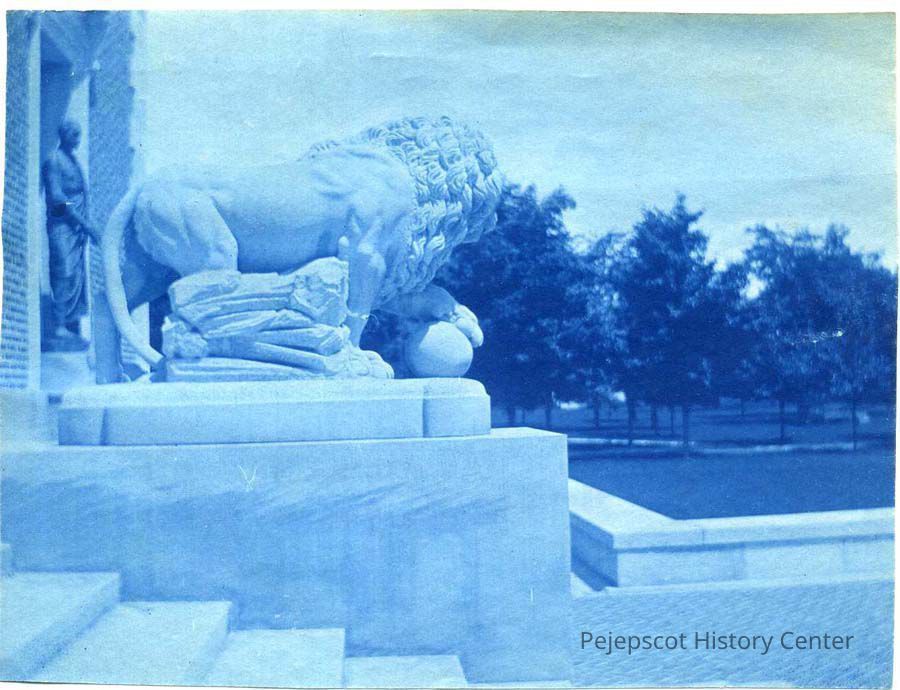 Blue finish photograph, horizontal view of the stone lion on the left of the steps to the Walker Art Museum at Bowdoin College, looking across the campus.