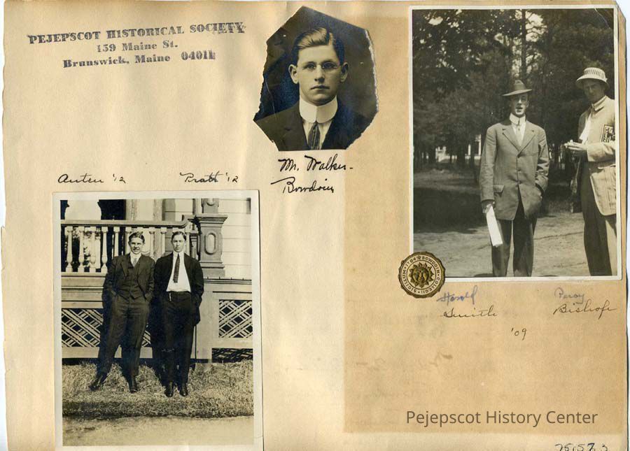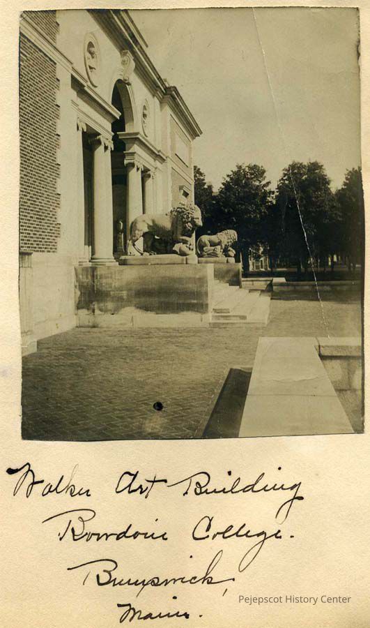 A sepia toned photograph of the Walker Art Building at Bowdoin College, Brunswick, ME. The photo is taken at an angle of the front entrance to the art building, showing the two lion statues that stand on either side of the stairs leading to the door. On the back is a photo of Mr. Walker, a photo of [Auteu], '12, and Pratt, '12, and a photo of Harold Smith and Persy Bishop, '09. All photos on the back are black and white. On the bottom left hand corner of the photo of Smith and Bishop is a seal with a sun in the middle and which reads, "Bowdoin College-Sigillum-1794".