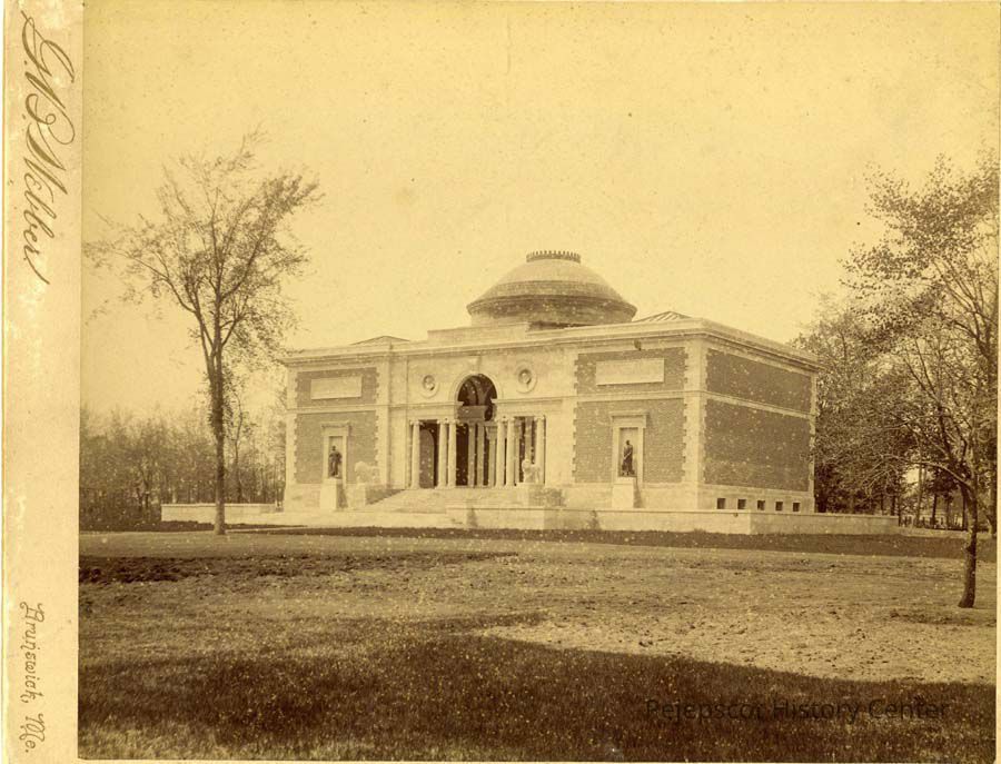 A sepia toned photo of the Walker Art Building, now Bowdoin College Museum of Art, on the Bowdoin College campus in Brunswick, Maine. Undated.