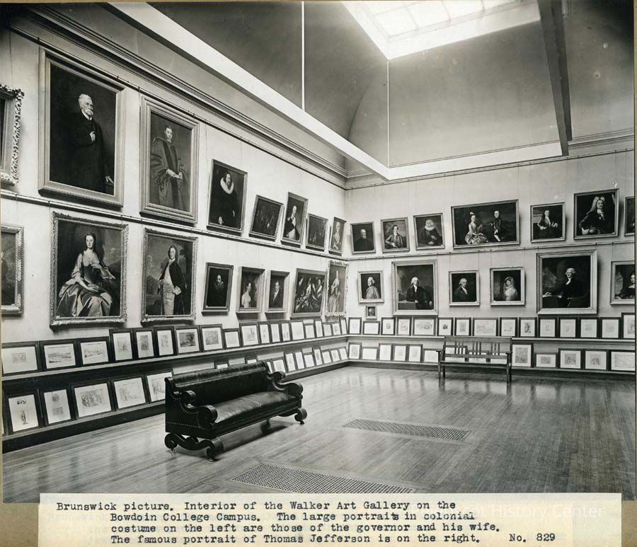 A black and white photograph of the interior of the Walker Art Gallery at Bowdoin College. The picture is taken towards the corner of the room, showing two walls of portraits. Two benches rest in front of the walls. The large portraits in colonial dress on the left are those of the governor and his wife. The famous portrait of Thomas Jefferson is on the right. Undated