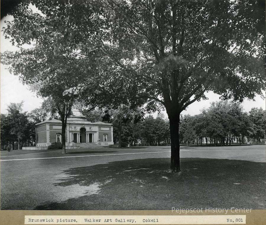 A black and white photo of Walker Art Gallery on Bowdoin College campus. Undated