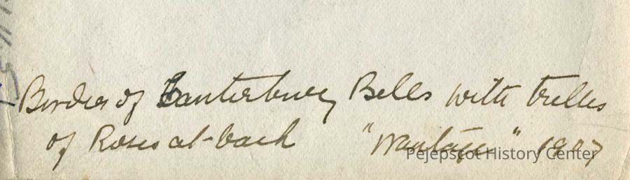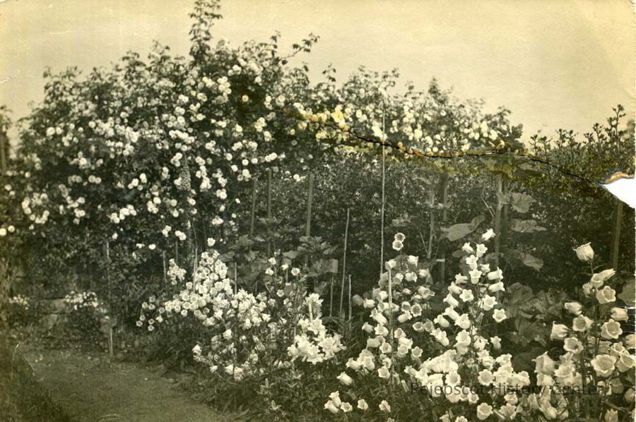 A black and white photograph of flowers. Writing on the back says "Border of Canterbury Bells with trellis of Roses at back "Wantage" 1907."