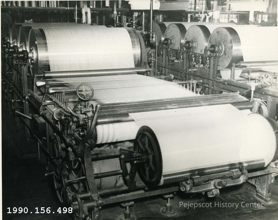 A B/W photograph of the Warp Room in the Cabot Mill. Undated