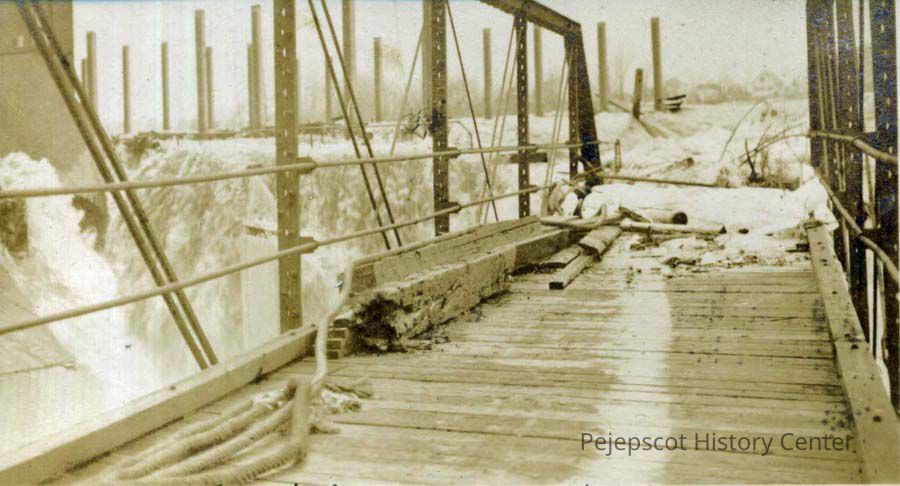 A B/W photo of the washed out bridge near the pulp mill (upper falls) in Topsham, ME during a flood on the Androscoggin River. Photo dated 1936.