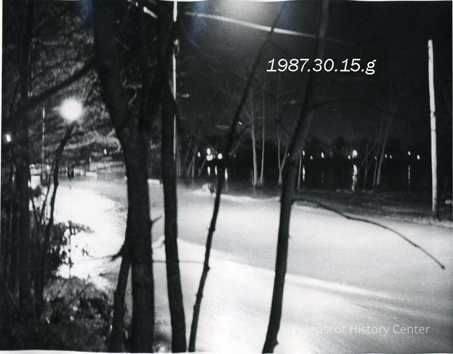 A B/W photograph of water rushing down Mill St. Brunswick, Maine. Taken April 1, 1987