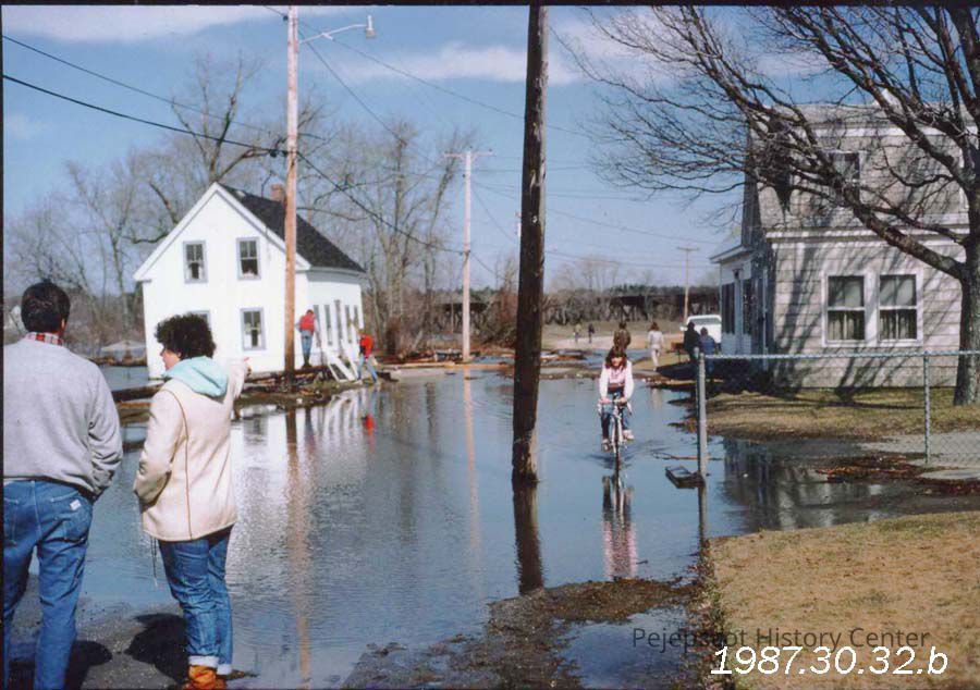 A color photograph of a flooded Water Street, Brunswick, Maine.