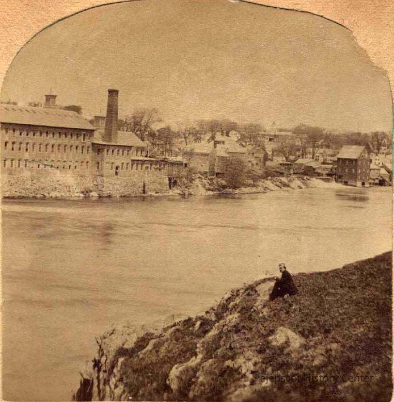 Paper Mill and river taken from Water Street in Brunswick prior to 1880. At extreme right, grist mill of Paul Hall. Just to the right of the paper mill is the woodworking plant of Dana Colby, burned in the early 1900s. Undated