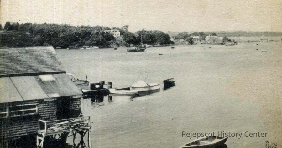 A B/W photograph of "Along the waterfront", Bailey Island.