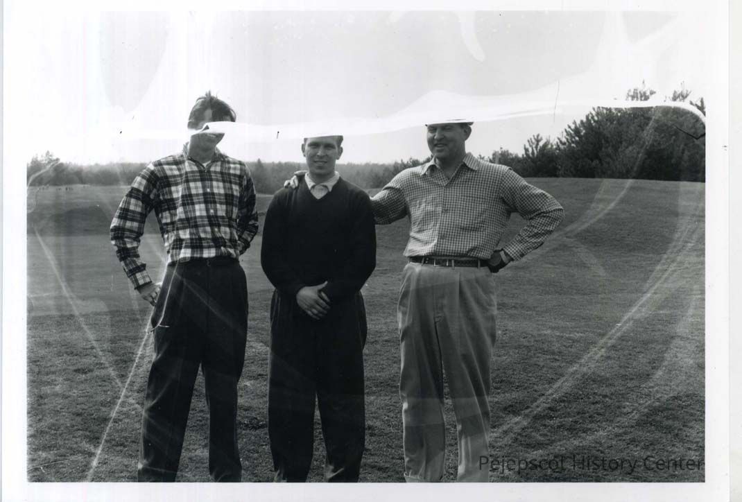 Waterville golfers, John Dolloff, Dick Deversi, and Henry Collins probably at the Patriot's Day Golf Tourney on 4/16/55.