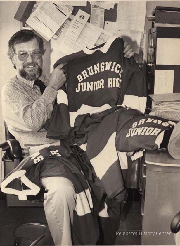 A black and white photo of Wayne Libby holding a Brunswick Junior High School jersey., was published in The Times Record in Brunswick, Maine, on 3/29/1988.