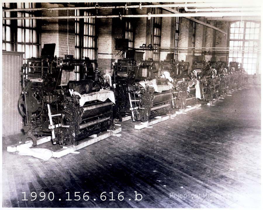 A B/W photograph of the Weave Room in the Verney Mill. It shows several machines, but none appear to be running. No one is shown working there. Undated