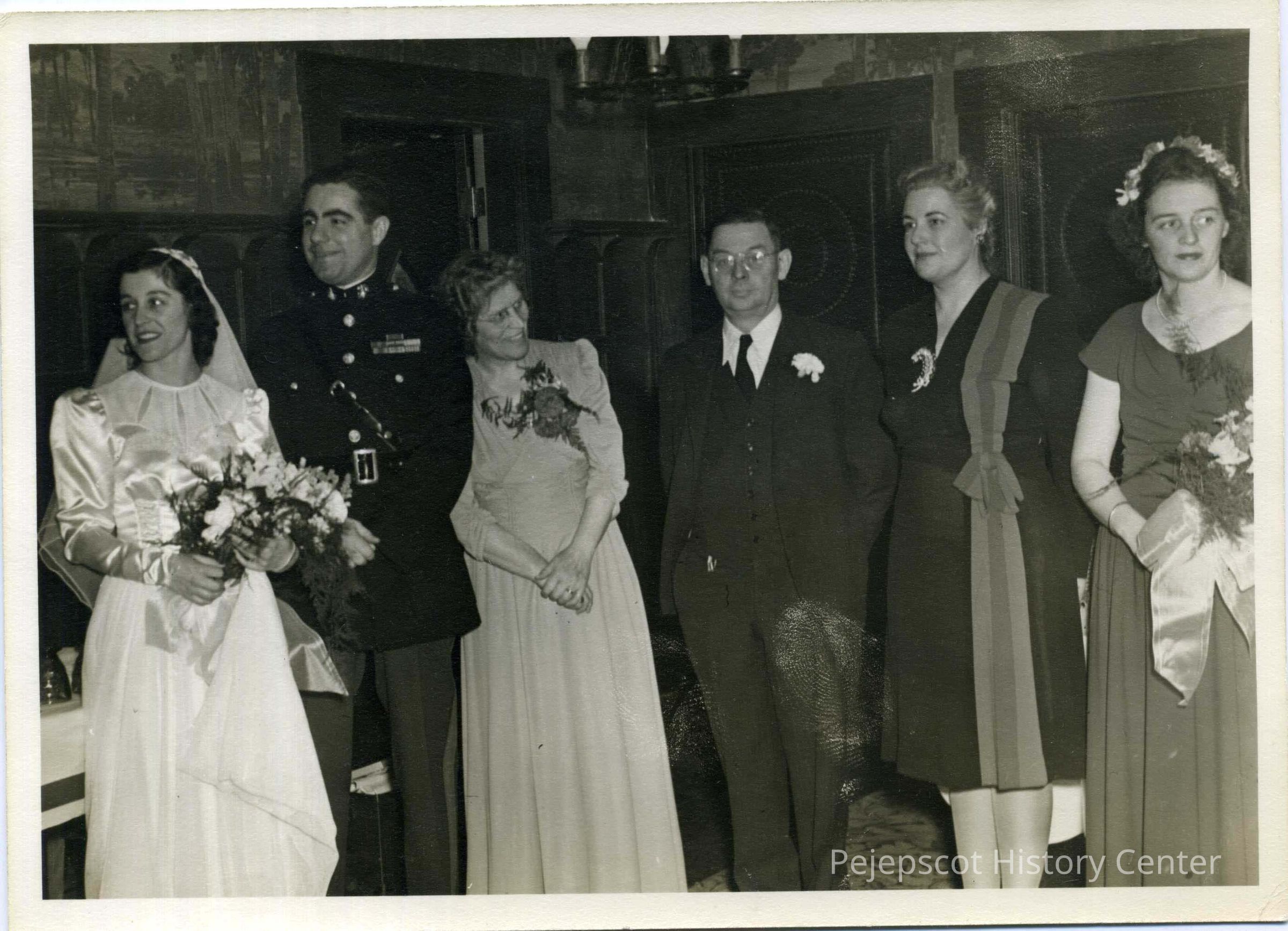 The receiving line at the wedding reception of John R. Chaisson and Marguerite H. Martin at the Hotel Eagle. The picture shows, from left to right, the bride and groom, the bride's parents, Mr. & Mrs. Carl Martin and two women identified as "sisters"-- the first is possibly the groom's sister, the other is the bride's sister, Catherine Martin. 02/22/1946Lexicon