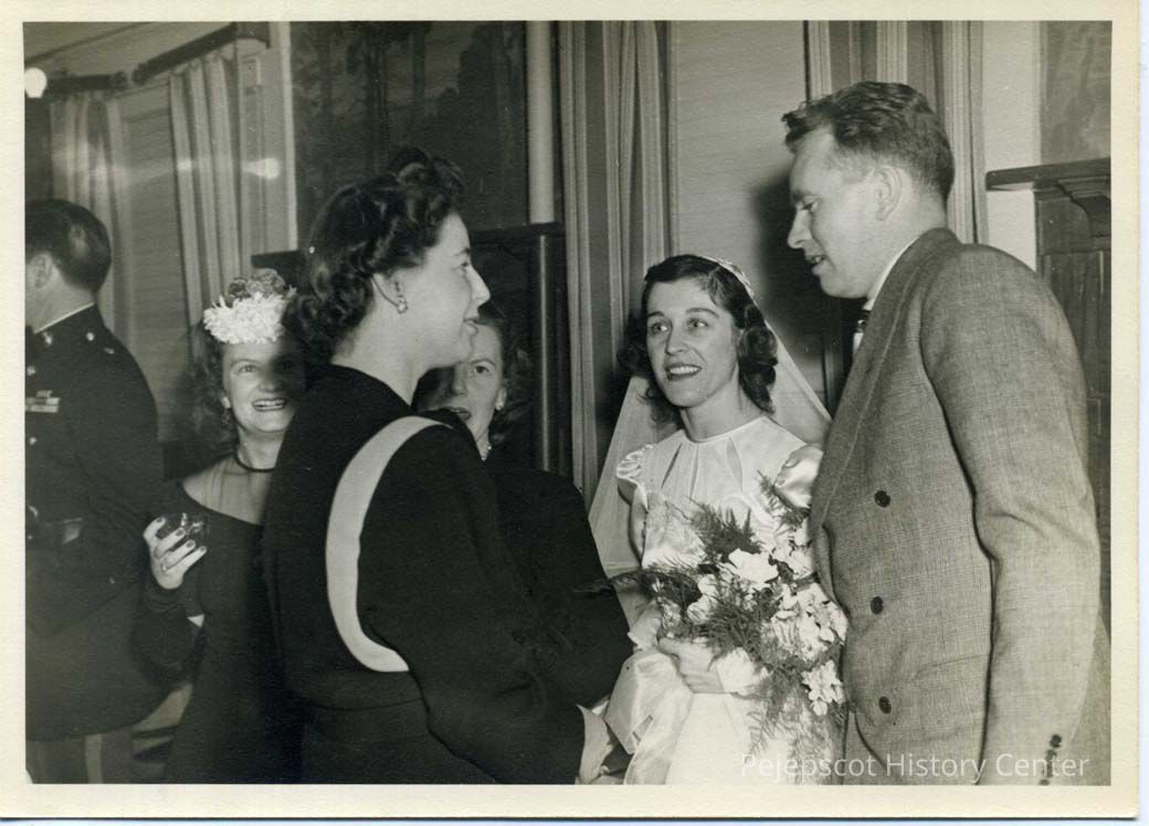 Bride talking with guests at the wedding reception of Marguerite H. Martin and John R. Chaisson at the Hotel Eagle. 02/22/1946
