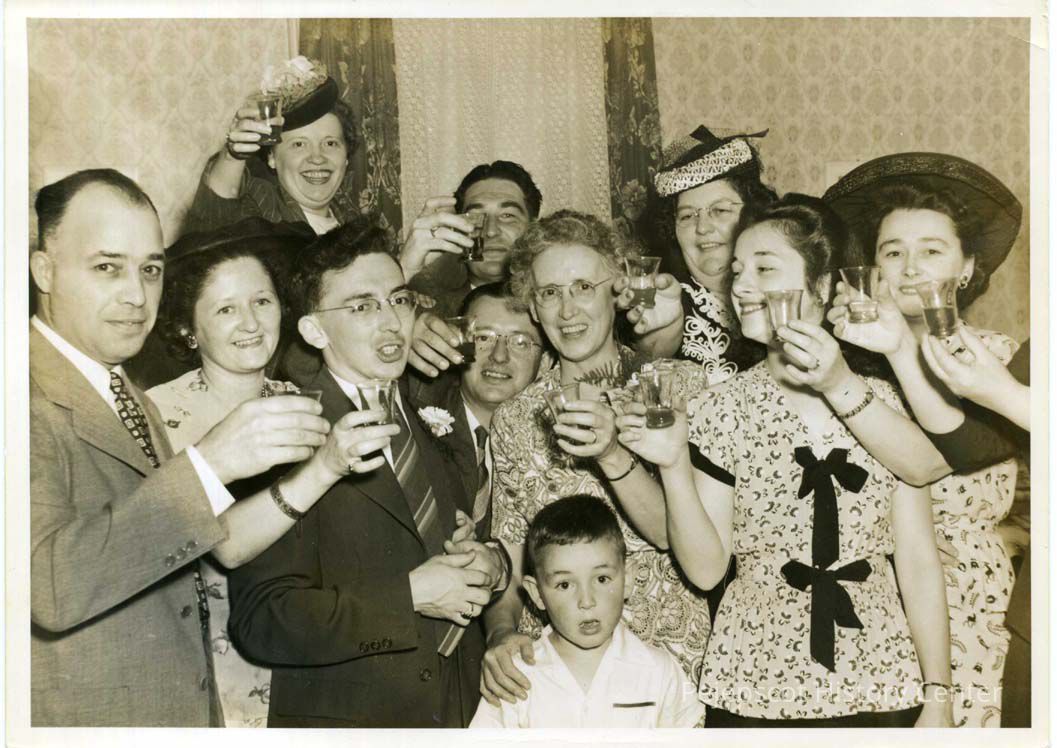 Group photo of friends and family toasting Claude at his and Olive St. Pierre's wedding reception. The photo includes Mrs. Anna St. Pierre, Arthur and Rosa Benoit (far left and far right) and their daughter Lorraine Benoit (next to Mrs. Benoit), and Mrs. Fortin. In the back row; Mrs. Fortin, Mario Fortin, Bea Nickerson. UndatedLexicon