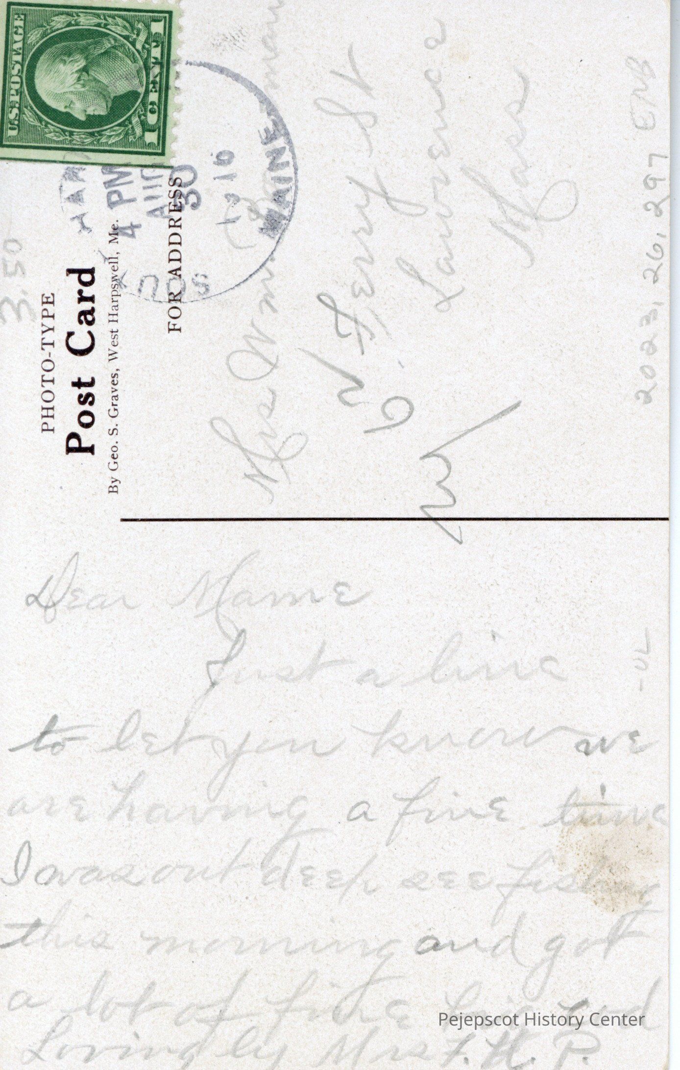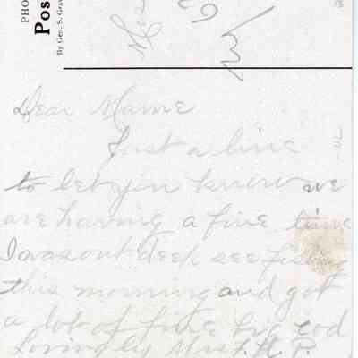 Just a line to let you know we are having a fine time. I was out deep see fishing this morning and got a lot of fine big cod. Lovingly, Mrs. F.H.P.