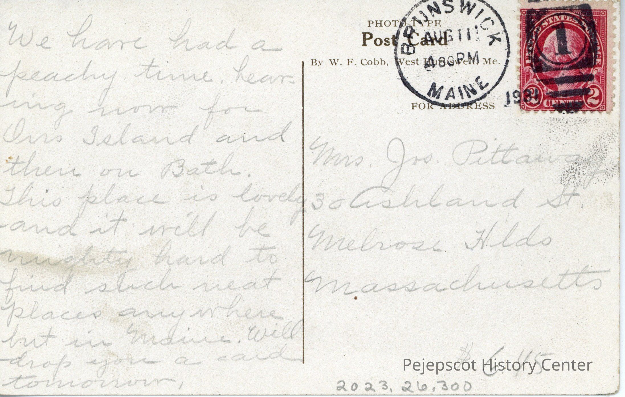 We have had a peachy time. Leaving now for Orrs Island and then on Bath. This place is lovely and it will be mighty hard to find such neat places any where but in Maine. Will drop you a card tomorrow.