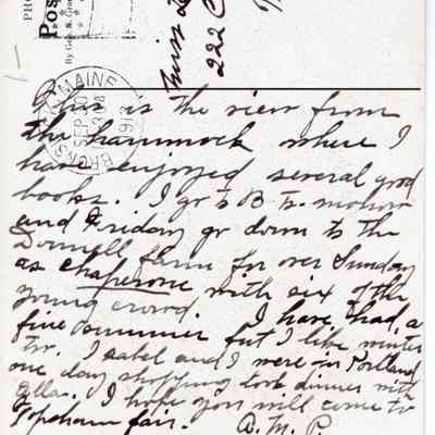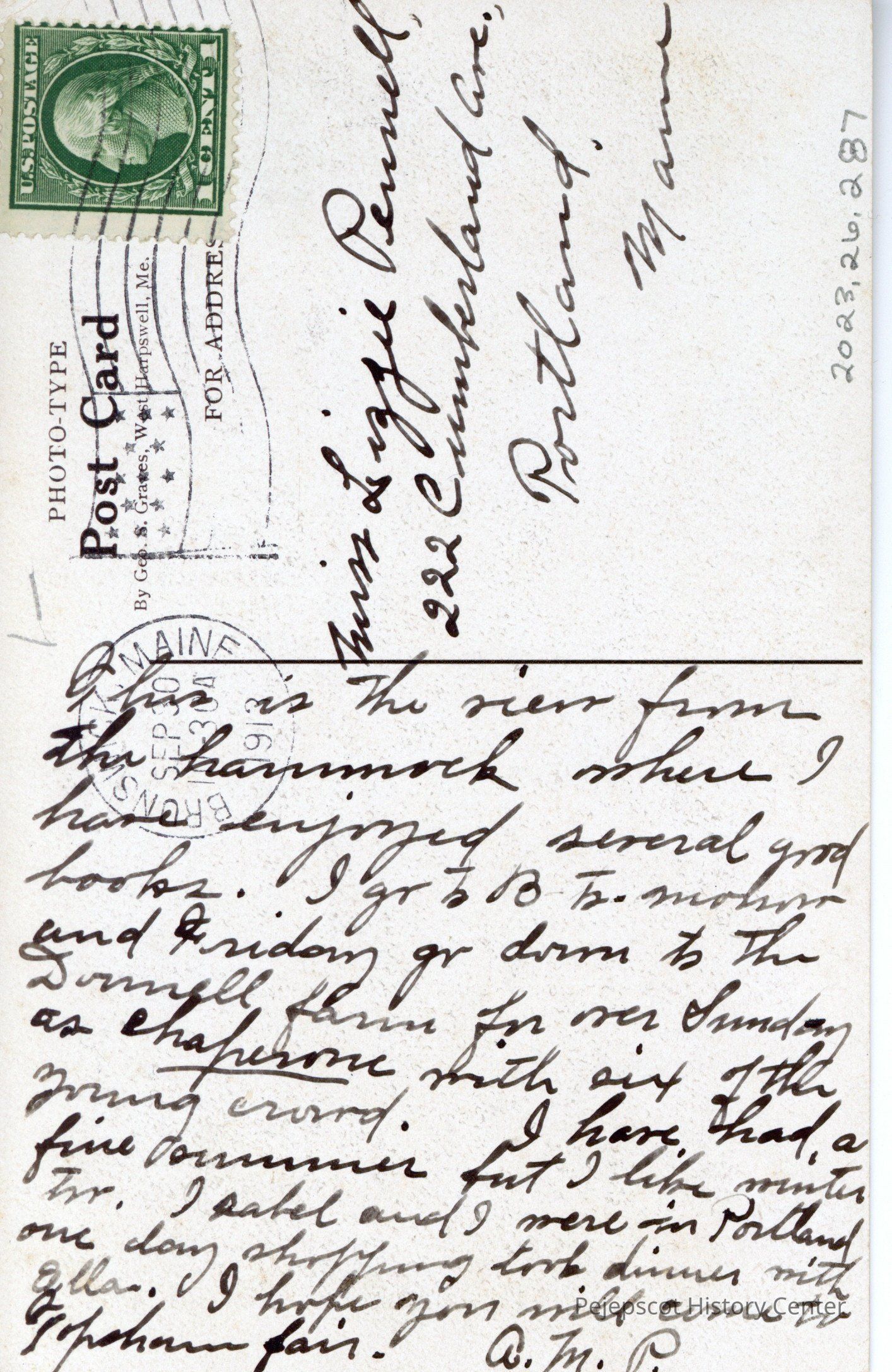 This is the view from the hammock where I have enjoyed several good books. I go to B tomorrow and Friday go down to the Donnell Farm for Sunday as chaperone with six of the young crowd. I have had a fine summer but I like winter too. Isabel and I were in Portland one day shopping and took dinner with Ella. I hope you will come to the Topsham fair. A. M. P.
