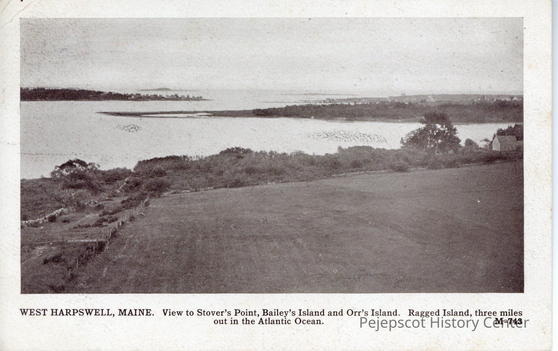 Black and white photo postcard of the view from West Harpswell, Maine, to Stover's Point, Bailey's Island, Orr's Island and Ragged Island, three miles out it the Atlantic Ocean.Collection