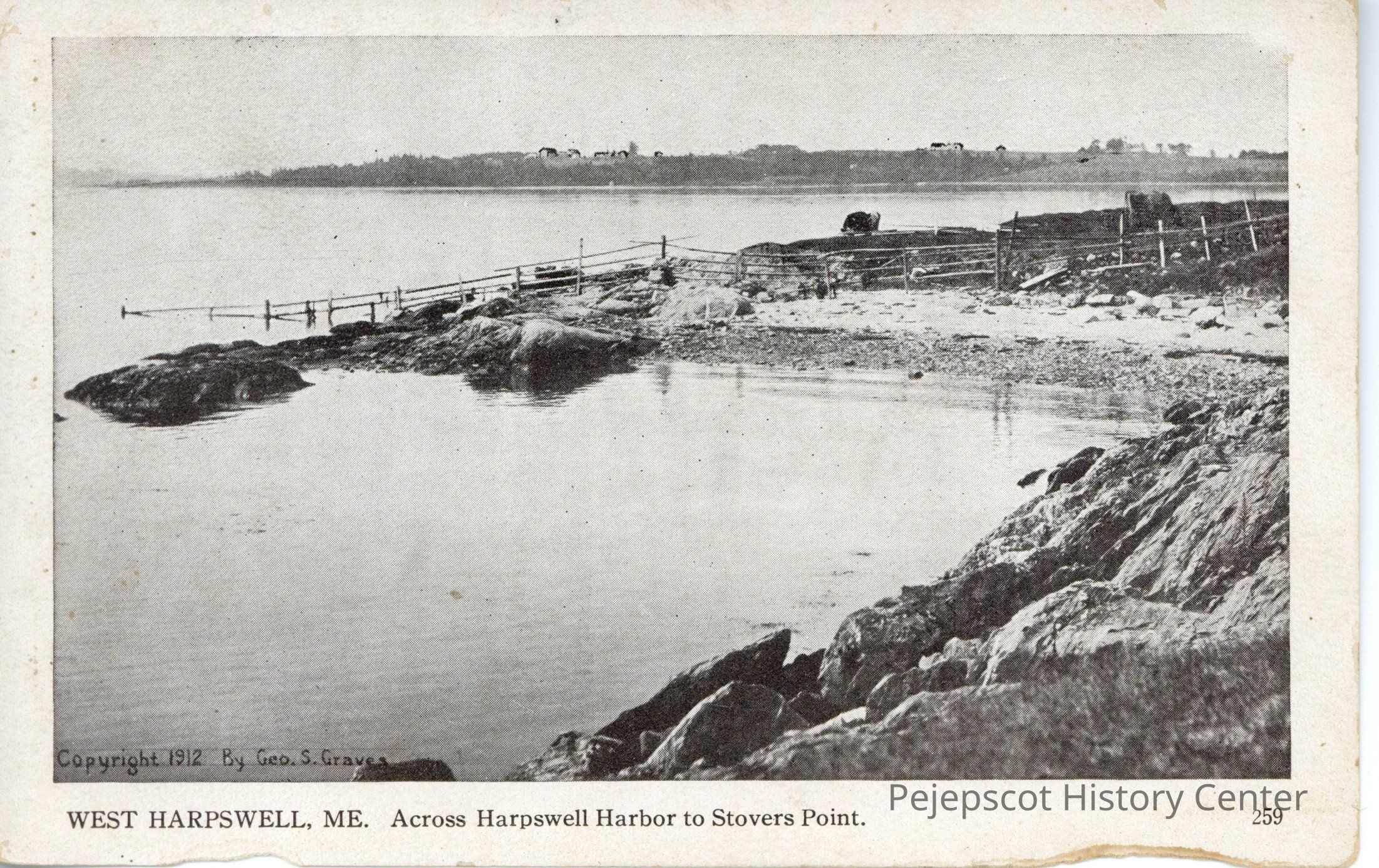 Black and white photo postcard of the view across Harpswell Harbor to Stovers Point, West Harpswell, Me.Collection