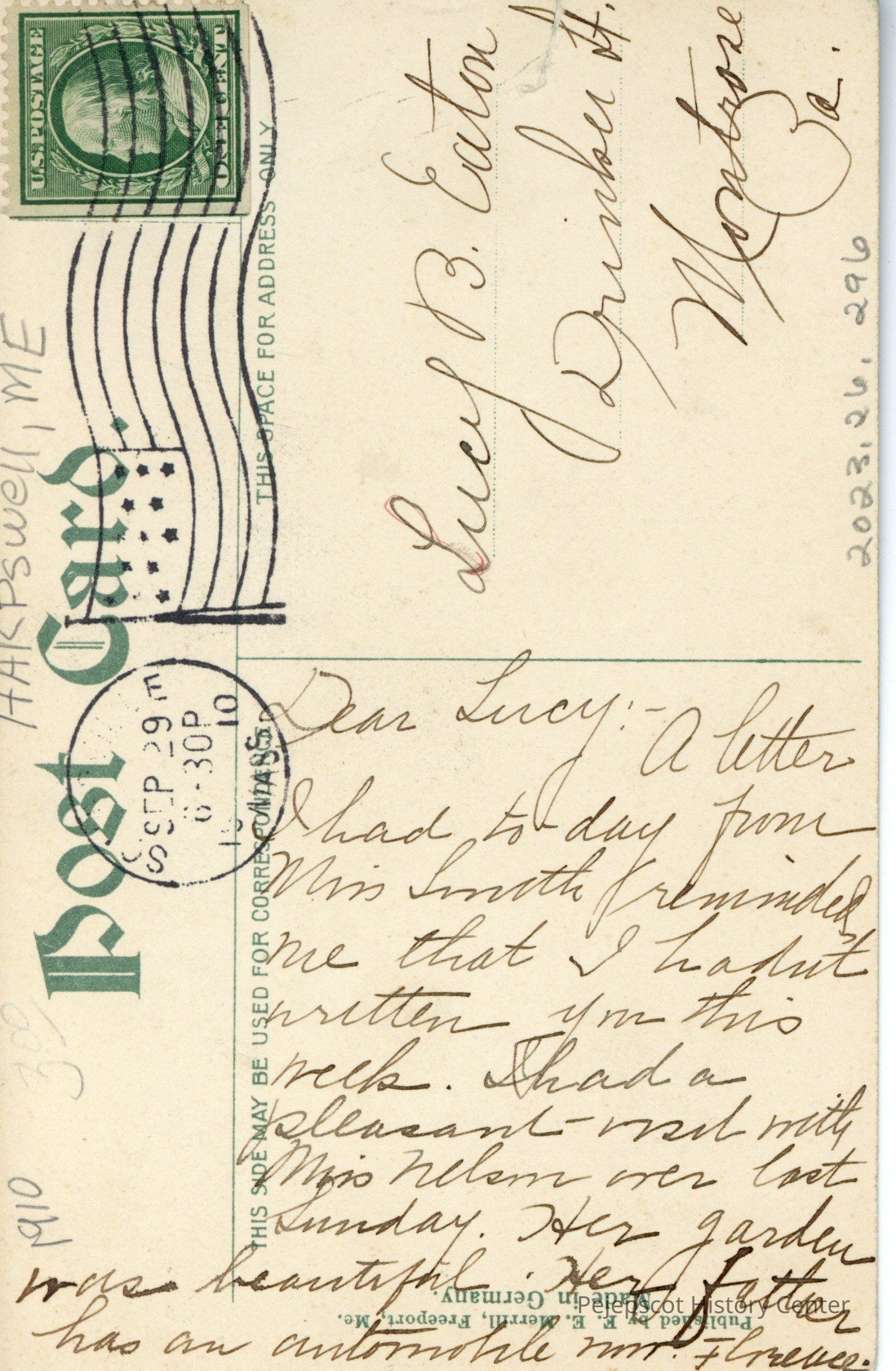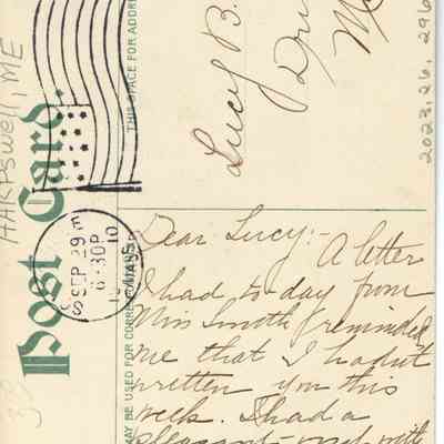 Dear Lucy :- A letter I had today from Miss Smith reminded me that I hadn't written you this week. I had a pleasant visit with Miss Nelson over last Sunday. Her garden was beautiful. Her father has an automobile now. Florence