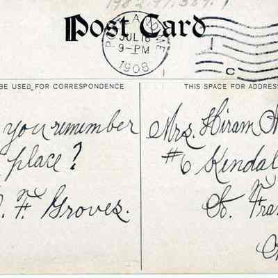 The postcard is address to "Mrs. Hiram Merriman, #6 Kendall St., So. Framingham, Mass." and on the back is written: "Do you remember this place? J.F. Groves." The postcard is postmarked 1908.Collection