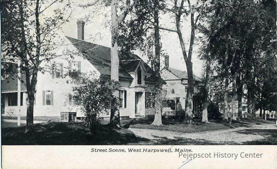 A black and white picture postcard of an unidentified "Street Scene, West Harpswell, Maine", published by F.E. Merrill of Freeport.