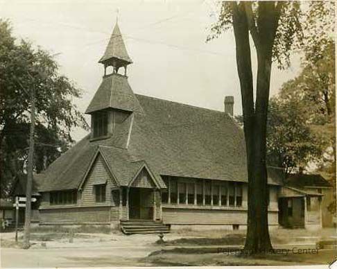 A B/W photograph of Wheeler Hall at the corner of Federal Street and Jordan Avenue. In 1990 it was the Church of Christ. Undated