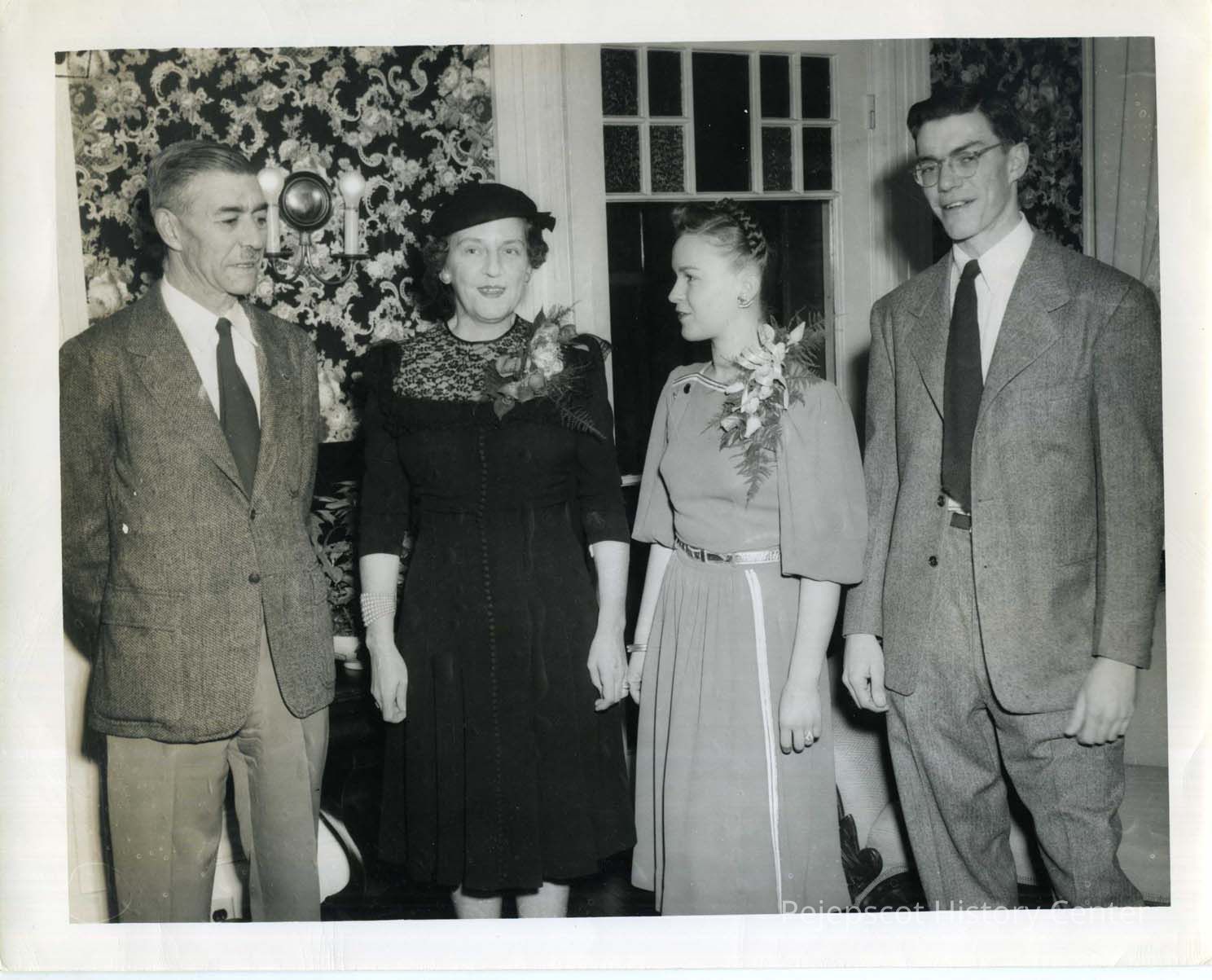 Engagement party for Susan White and Franklin Crouch. They are standing next to an older, unidentified couple. Undated