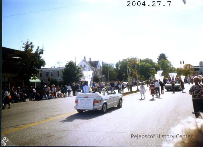 A color photograph of Brunswick's 250th Anniversary Parade (Oct 1989) showing a white car (from the rear) with a women dressed in white sitting on the back seat. people in front are carrying triangular signs with "250" on them.