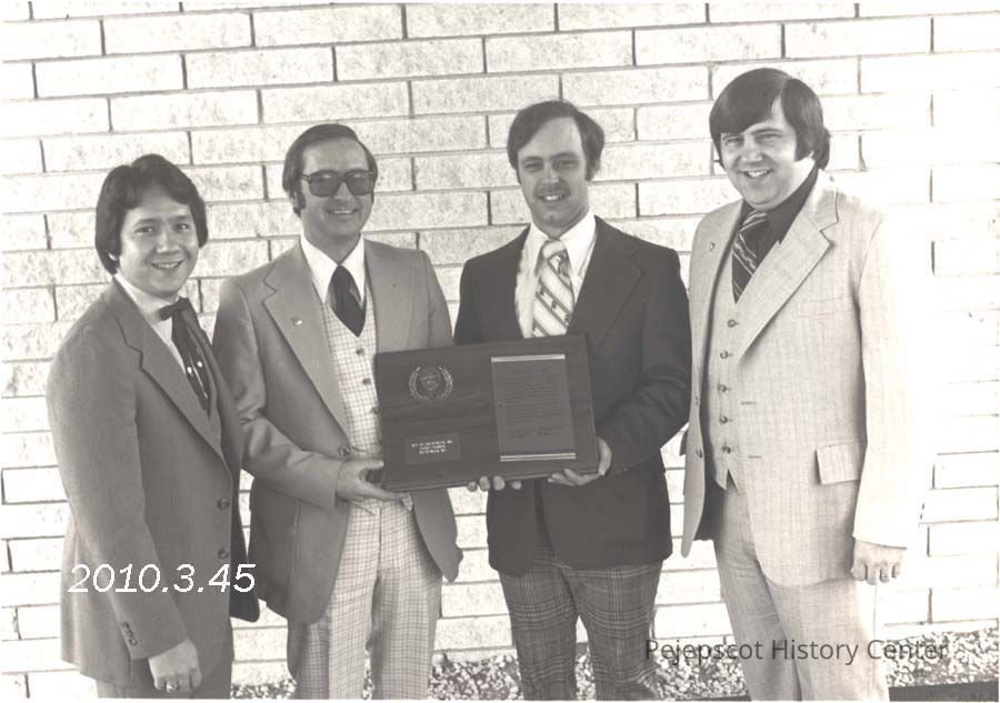 A B/W photograph of a presentation of the White Glove award to Kentucky Fried Chicken. In the photo are Milt Smith, Jim Brown, Mark Weir and Fred Gallant. This photo was published by the Times Record. Undated