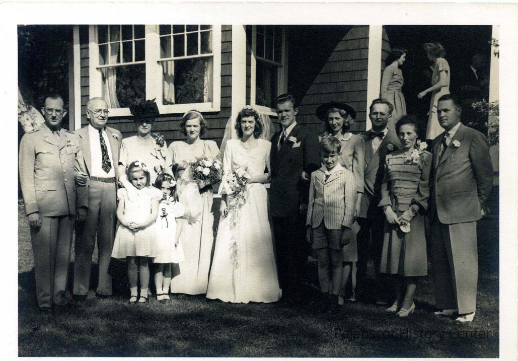 A photo of the bride and groom, Jane Whitman and William Van Blarcom, standing in front of the Whitman Mere Point home possibly with family members. Undated