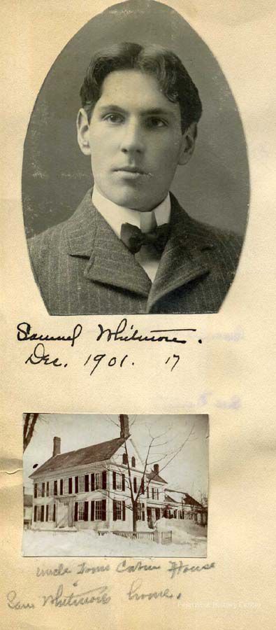 Black and white photographs of Samuel Whitmore, aged 17, and Whitmore's house on Federal Street, Brunswick, ME. The house is also the Harriet Beecher Stowe house, where Stowe wrote Uncle Tom's Cabin, as written on the card. ( aka the Harriet Beecher Stowe house). Dated December, 1901.Lexicon