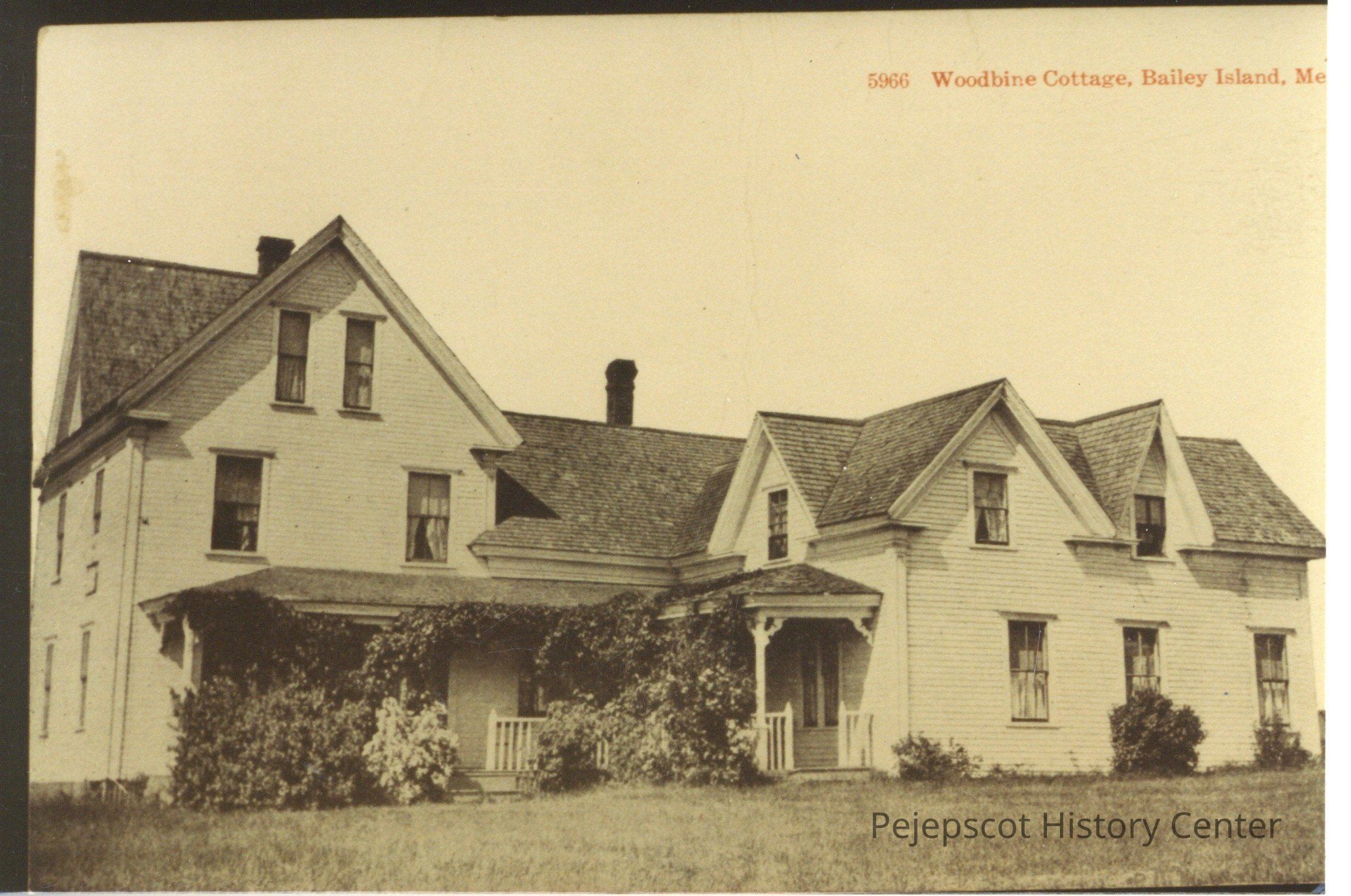 A black and white copy of a print copy of the Woodbine Cottage, Bailey Island. See accession # 1990.115.63