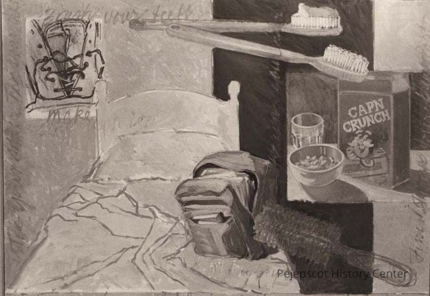 A black and white photograph of an oil painting on canvas titled, "Who's in Charge" by Nina Jerome. Jerome is a longtime resident of Maine finding inspiration in natural and constructed environments. After graduating from Mount Holyoke College and the Rhode Island School of Design, Jerome taught drawing and painting at the University of Maine for 27 years, while continuing her own craft.