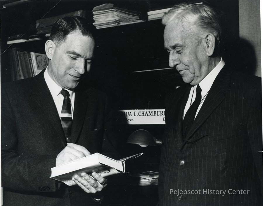 B/W photo of Willard W. Wallace signing his book, "Soul of the Lion" for Emery Booker. No date