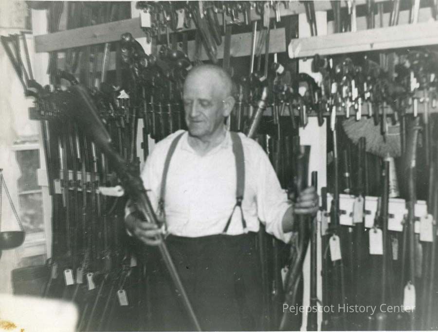A B/W photographic view of Billy Edwards standing in front of a rack guns which are tagged. This is a duplicate of 1990.137.26.