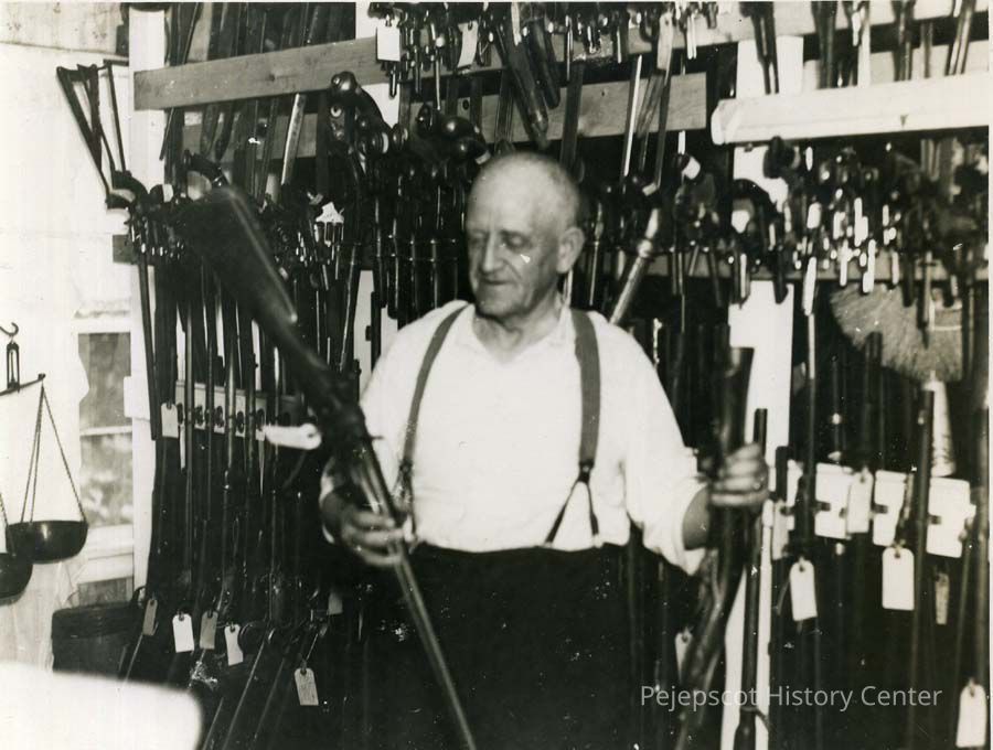 A B/W photograph of Billy Edwards, former Police Chief with some of the guns he had confiscated. Undated. This is a duplicate of 1986.22.4.n.