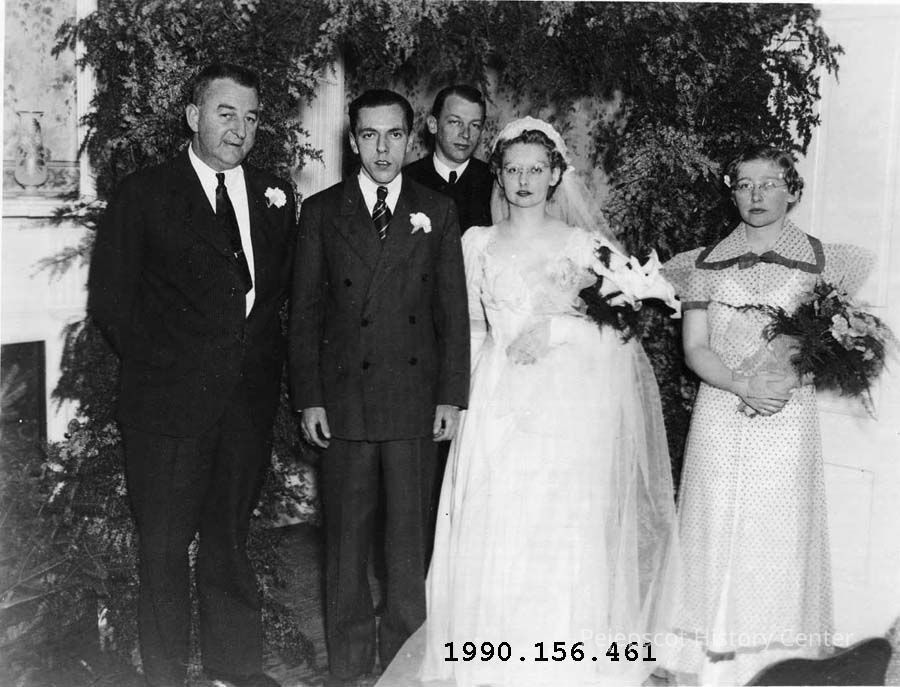 A B/W photograph of William Fortin and Rachel Patten wedding. The people are left to right: Perley Cotton (best man); William Fortin; Rachel Patten Allen, Mrs. Elizabeth Allen (maid of honor), and Reverend Christian (in back). UndatedCollection